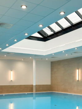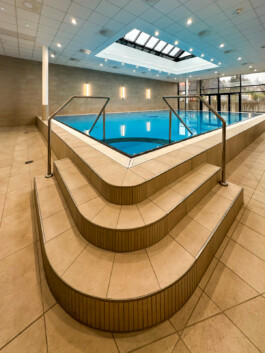 An das Bettenhaus der Reha-Klinik in Selent sollte ein neues Bewegungsbad angebaut werden. Dieses wurde als eine 1-geschossige Bebauung in Ergänzung des Untergeschosses errichtet. Aufgrund des tiefer liegenden Terrains in diesem Grundstücksbereich ragt der Neubau jedoch teilweise über das Gelände hinaus.